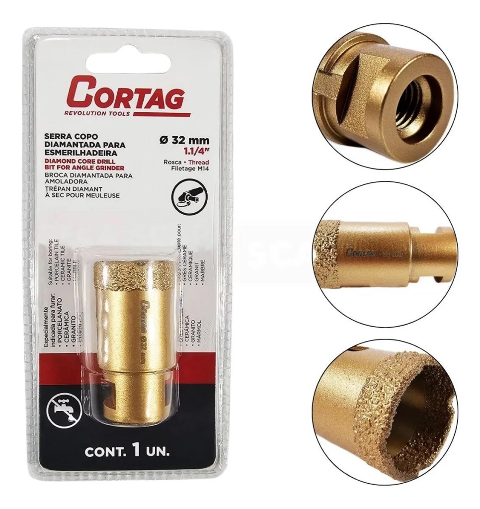 A Serra Copo Diamantada Cortag de 32 mm é a ferramenta ideal para profissionais que necessitam de precisão e eficiência na perfuração de materiais duros. Projetada especialmente para uso em esmerilhadeiras com rosca M14, ela é indicada para furar porcelanato, cerâmica, granito e mármore.